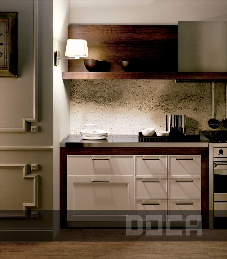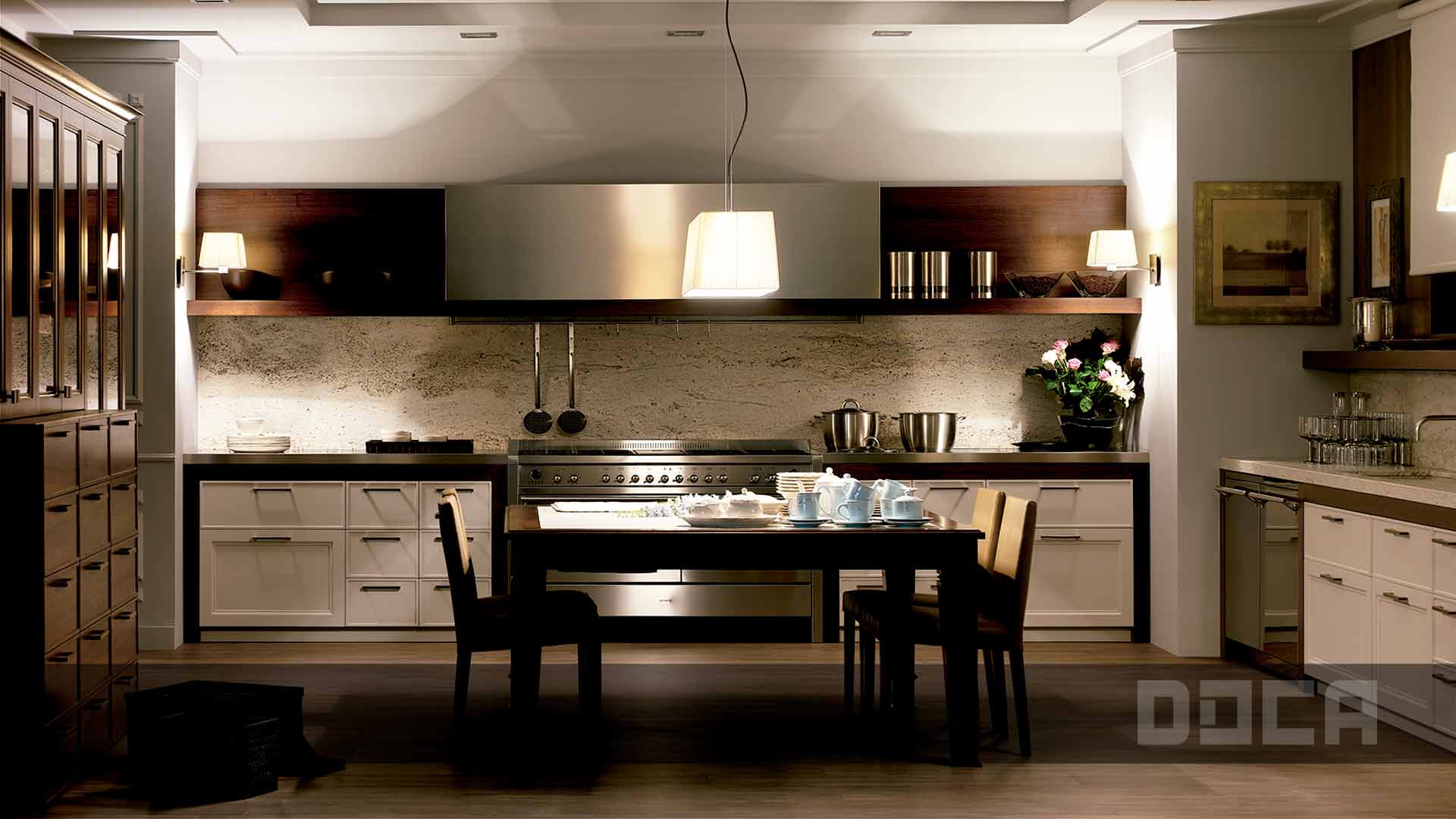 The Brocant Nogal collection emphasizes beauty in the details. Walnut wood and white cabinetry contrasted with the natural stone countertop, evokes a traditional style that gives a feeling of warmth without losing the design factor. Steel appliances give an industrial feel that accentuates the combination of modernity and tradition.