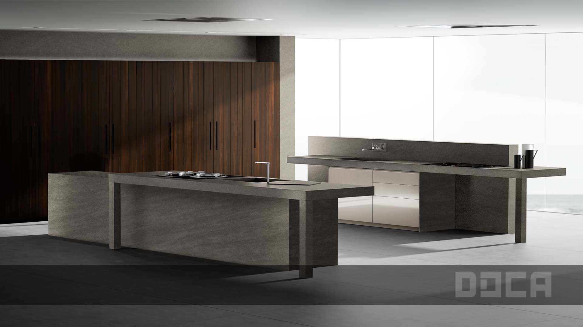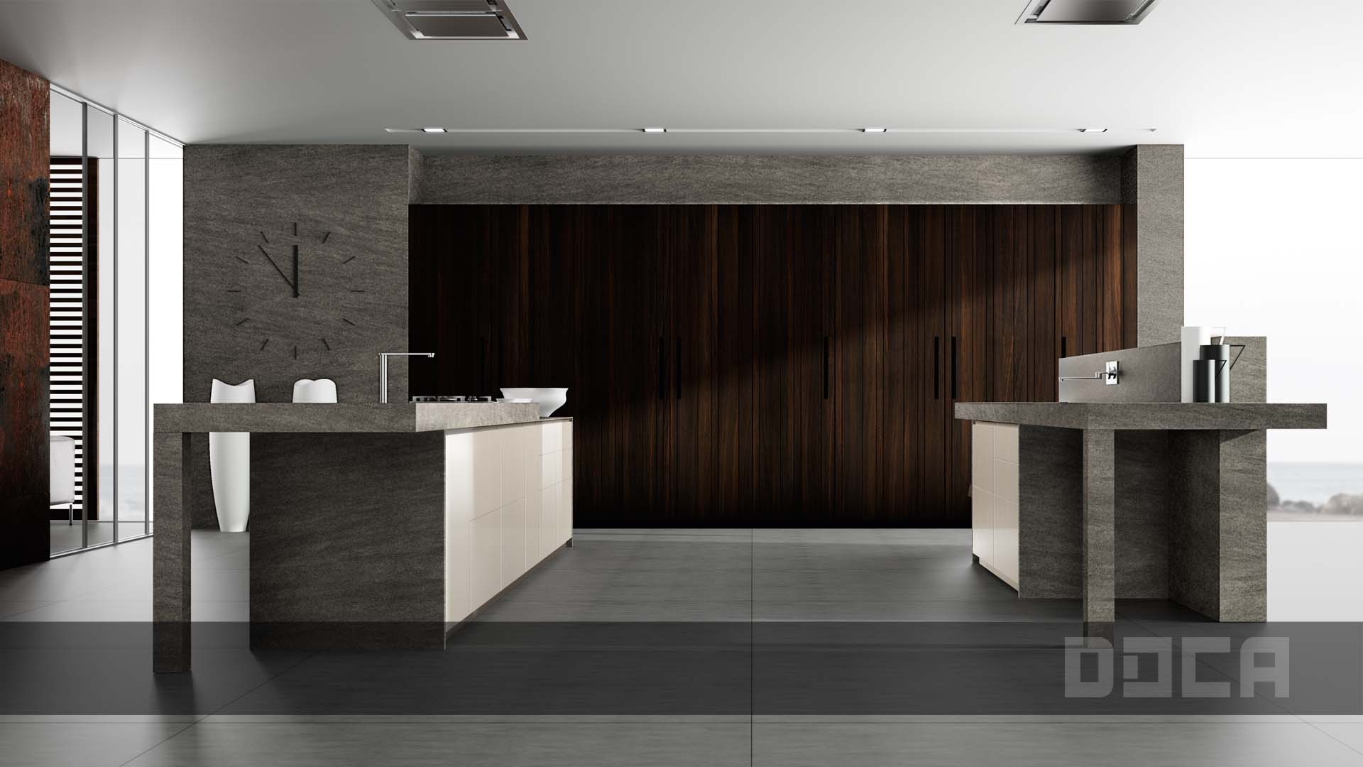 This kitchen has two islands with lots of workspace, where you can choose an electric cooker or a more traditional gas one. Both islands have Cusan model mechanized handles so that you can open the drawers and doors without the need for physical handles. The wood cabinetry in Traza with a Roble Old finish and mechanized Lyon handle creates lots of storage space so that you can have everything at hand but hidden from view.