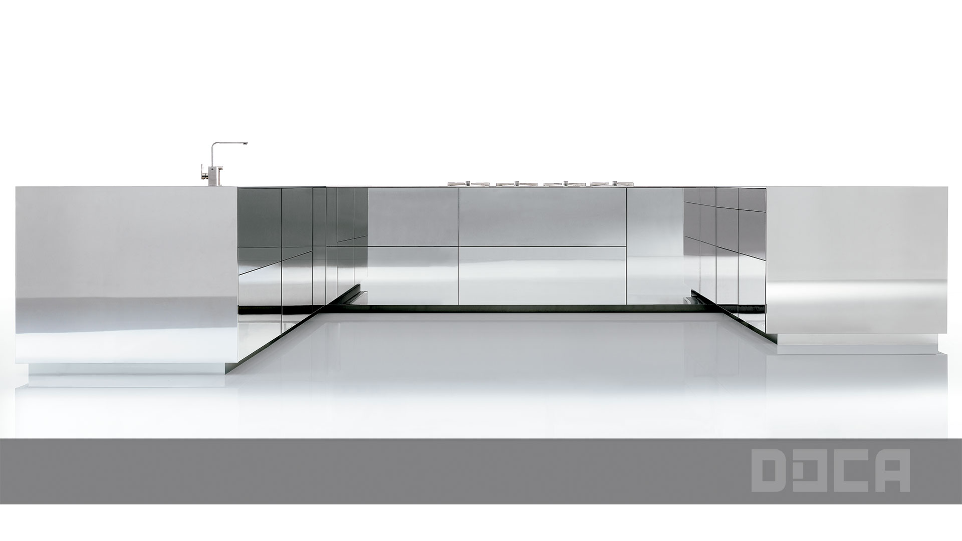 The Super Mirror kitchen elevates minimalism through the use of mirrored cabinetry.