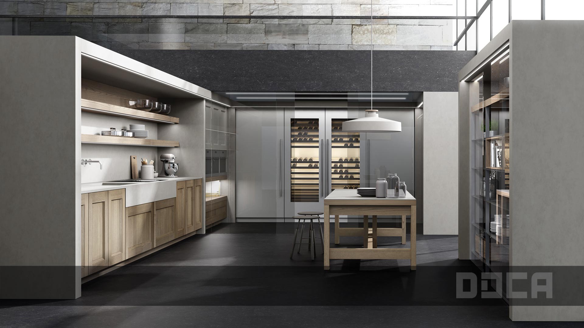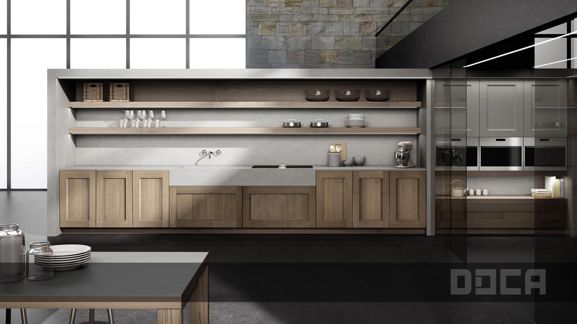 The traditionally structured cupboards framed in wood have been swapped for modern shelving to create a more open and free space to display items. The design is framed by a structure inspired by Neolithic concrete, which adds an industrial touch that adapts traditional to modern.